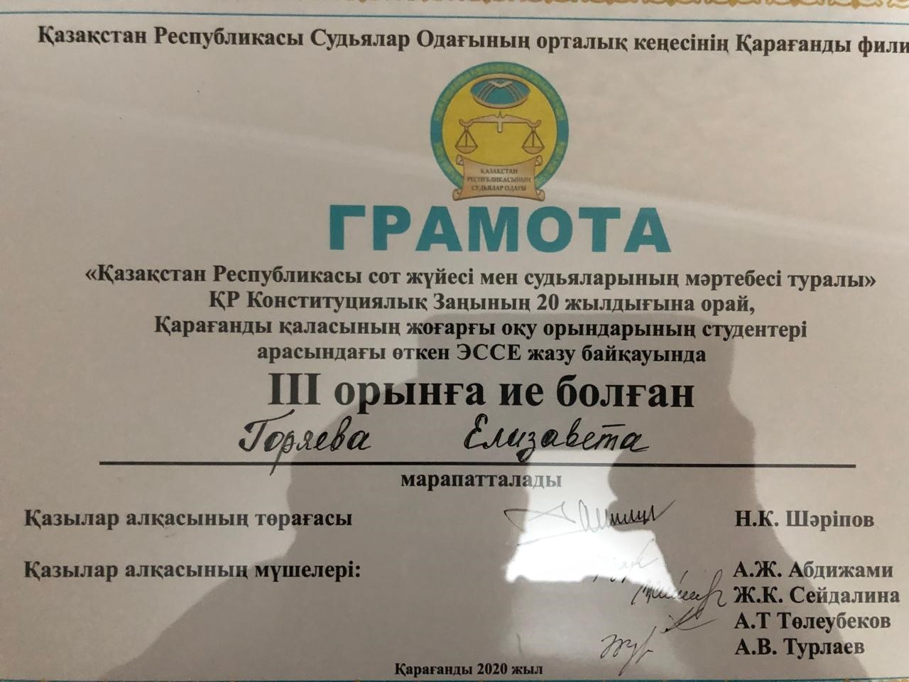 В номинации лучший капитан был признан студент 4-курса факультета бизнеса, права и технологии Ахметов Адильжан. В конкурсе эссе, организованный в рамках правовой спартакиады, почетными грамотами за ІІІ- место награждены студенты группы Ю-44 Горяева Е. и Алкенова Ж. группа Ю-41к.